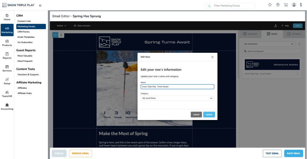 You can now save rows within the email editor for reuse across campaigns. Saved rows can be organized into categories and keywords, making it easy to build a library of reusable components like headers, footers, and promotional sections. This helps streamline email creation and ensures consistency across campaigns.