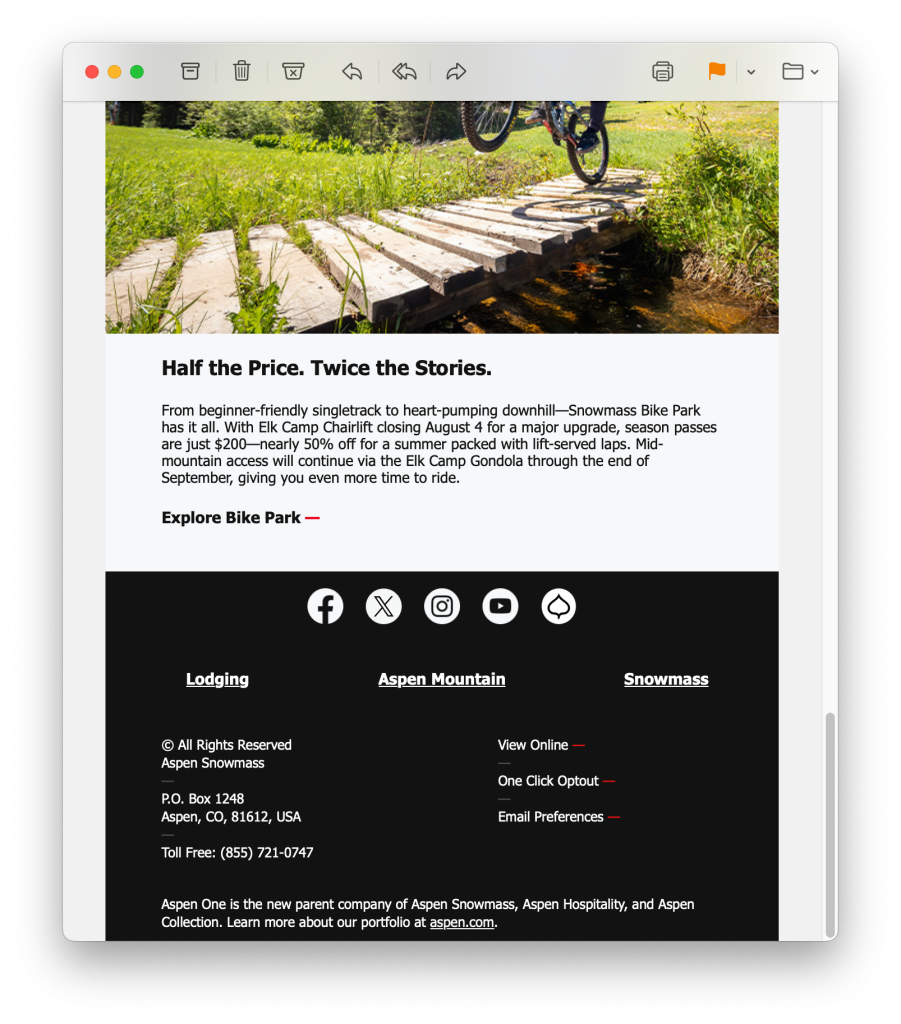Stick to a single topic per email: new passes & products, upcoming events, terrain openings, etc.
