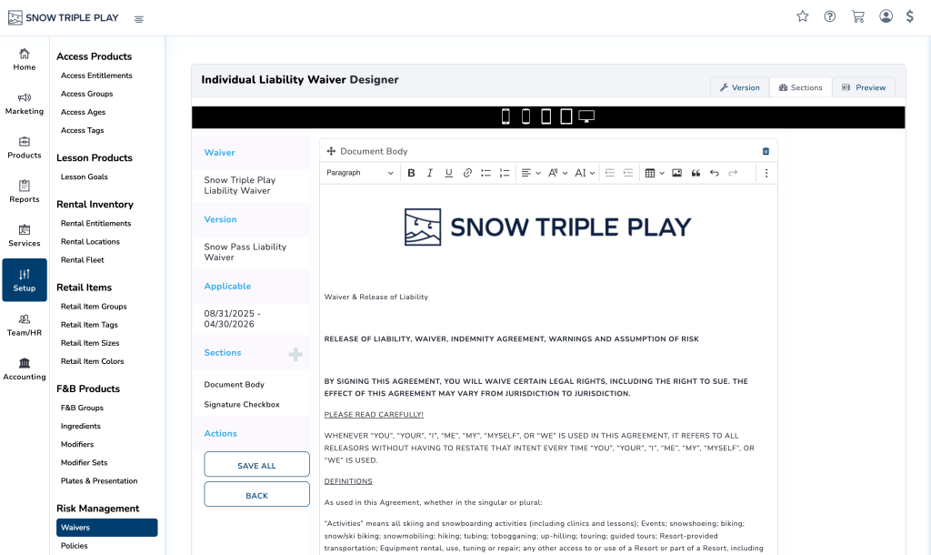 There is a new option to add images to waivers using the waiver editor in Risk Management Setup.